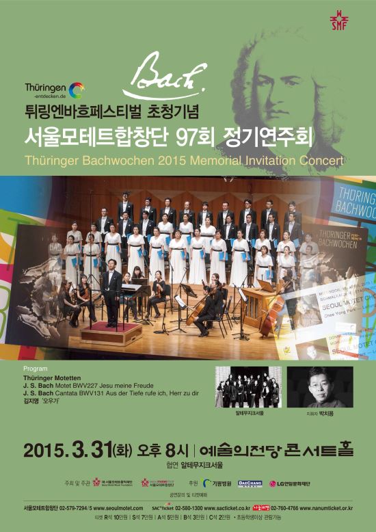 [쿠키뉴스=조현우 기자] 서울모테트합창단은 31일 오후 8시 서울 서초구 예술의전당 콘서트홀에서 ‘튀링엔 바흐페스티벌 초청기념 97회 정기연주회’를 갖는다. 바흐의 모테트 BWV 227 ‘예수는 나의 기쁨’을 연주한다. 모테트는 13세기에 생겨난 다성 성악곡이다. 또 칸타타 BWV 131 ‘여호와여 내가 깊은데서 부르짖나이다’, 김지영 작곡 ‘오우가’ 등을 연주한다.