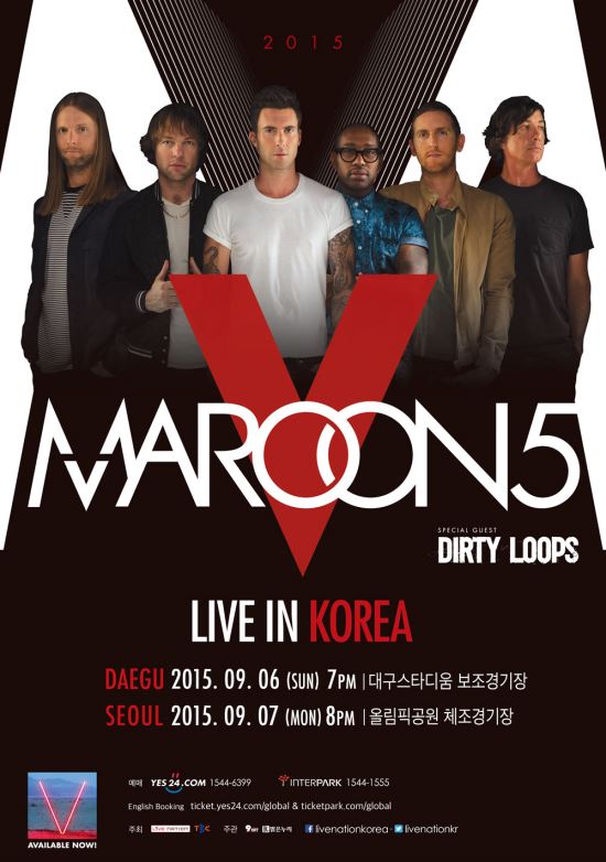 마룬 파이브의 내한공연은 9월 6일 대구스타디움 보조경기장, 9월 7일 서울 올림픽공원 체조경기장에서 개최된다. 다른 뮤지션의 곡을 재해석한 연주 영상으로 유튜브에서 화제가 된 스웨덴의 실력파 밴드 더티룹스(Dirty Loops)가 게스트로 무대에 선다.
