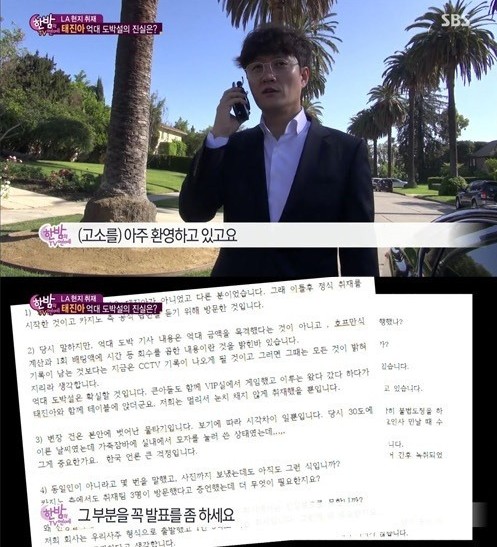 SBS ‘한밤의 TV연예’ 제작진은 미국 로스앤젤레스(LA) 현지를 찾아 태진아 해외 원정 억대 도박설의 진위 여부에 대해 취재한 내용을 1일 방송했다.