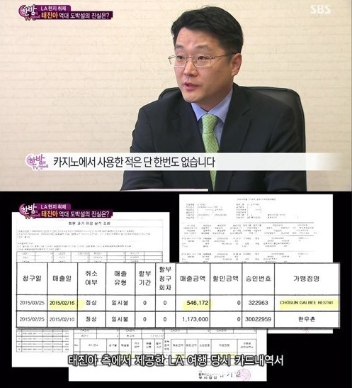 1일 방송된 SBS ‘한밤의 TV연예’에서 태진아의 담당 변호사는 “관련 자료는 다 검찰에 제출할 계획”이라며 당시 카드내역을 최초로 공개했다.