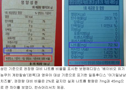따라서 영유아용 식품의 권장량 대비 나트륨 함량이 성인 기준으로 표기되면 나트륨 과잉 섭취가 불가피하다.