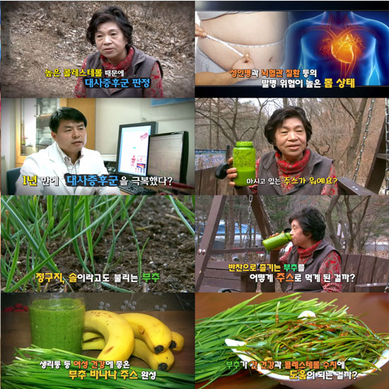 특히 이날 방송에 출연한 한 60대 여성 사례자는 고중성지방 증상으로 체내 지방량이 정상치의 5배를 웃도는 높은 수치였고, 좋은 콜레스테롤 수치 또한 현저히 낮아 심각한 대사 증후군을 겪고 있었다.”고 사연을 전하면서 “부추를 꾸준히 먹었다. 상대적으로 많은 양의 유효 성분을 섭취하기 위해 부추를 사과, 바나나 등의 과일을 가미한 주스 형태로도 섭취했다.”면서 “당장 식습관이나 생활 습관에 변화를 주지 않았다면 뇌혈관 질환, 심혈관 질환 등에 걸릴 위험성이 몇 배는 높았을 것”이라고 밝혔습니다. 12일 밤 9시 40분 방송. [제공=MBN]