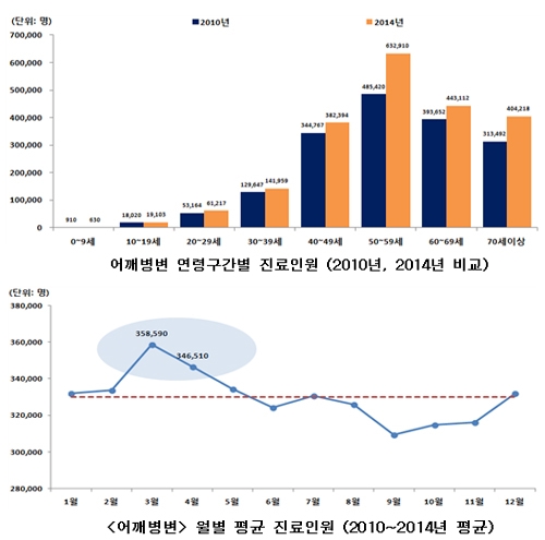 2014년 기준 연령별 진료인원은 50대가 63만3000여명(30.3%)으로 가장 많았다. 2014년 전체 어깨병변 진료인원 10명 중 3명이 50대였다는 것이다.