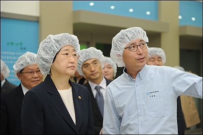 "[쿠키뉴스=박주호 기자] 김승희 식품의약품안전처장(사진 왼쪽)이 대전시 대덕구에 위치한 물휴지를 생산업체 유한킴벌리를 찾아 안전관리 전반을 점검했다. epi0212@kukimedia.co.kr
