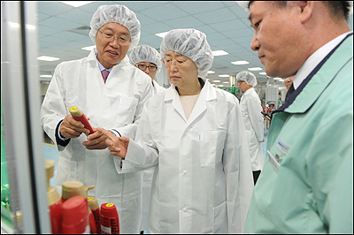 [쿠키뉴스=박주호 기자] 김승희 식품의약품안전처장(사진 가운데)이 대전시 대덕구 소재 샴푸·치약 생산업체 아모레퍼시픽을 방문해 안전관리 전반을 점검했다. epi0212@kukimedia.co.kr