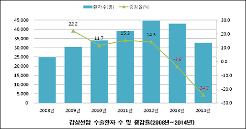 2008년부터 2014년까지 최근 7년간 건강보험 심사결정 자료를 이용해 ‘갑상선암 수술’의 진료 추이를 살펴보면, 수술환자 수는 2008년부터 2012년까지 4년 연속 증가추세였으나(4년간 연평균 증가율 15.8%) 이후 2년 연속 감소해 2013년은 전년대비 3.6% 감소한 4만3157명, 2014년은 24.2% 감소한 3만2711명으로 나타났다.