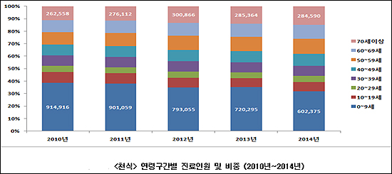 천식 진료 인원이 가장 많은 연령대는 10대 미만이었다. 이 연령대에서 2014년 60만2000여명이 진료를 받아 전체의 31.8%를 차지했다.