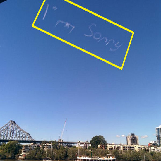 ABC뉴스 리포터 캐시 맥리쉬(Kathy McLeish)는 자신의 트위터에 ""하늘에 엄청나게 큰 글씨가 떴다. 남자가 여자 친구한테 정말 많이 잘못했나 보다.""며 사진을 게재했는데, 그러나 아직까지 이 메시지를 작성한 사람이 누구인지, 받는 이는 누구인지가 밝혀지지 않아 미스터리한 상태입니다.