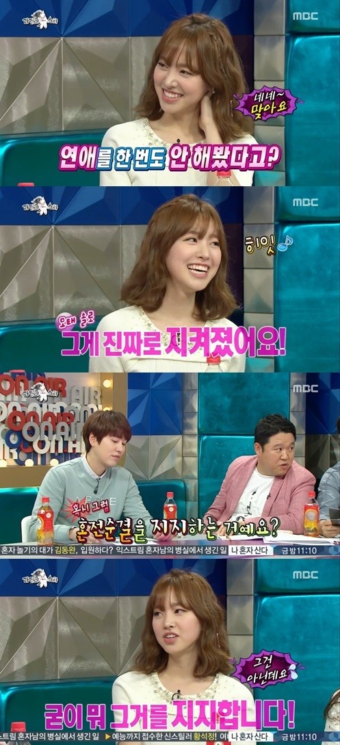 이날 진세연은 모태솔로인 것에 대해 “학생 때는 엄마랑 같이 20살 되면 연애를 하자고 장난스러운 약속을 했었는데 그게 진짜로 지켜졌다”며 “20살이 됐는데 일을 하고 있다보니 (연애를 안했다)”고 밝혔다.