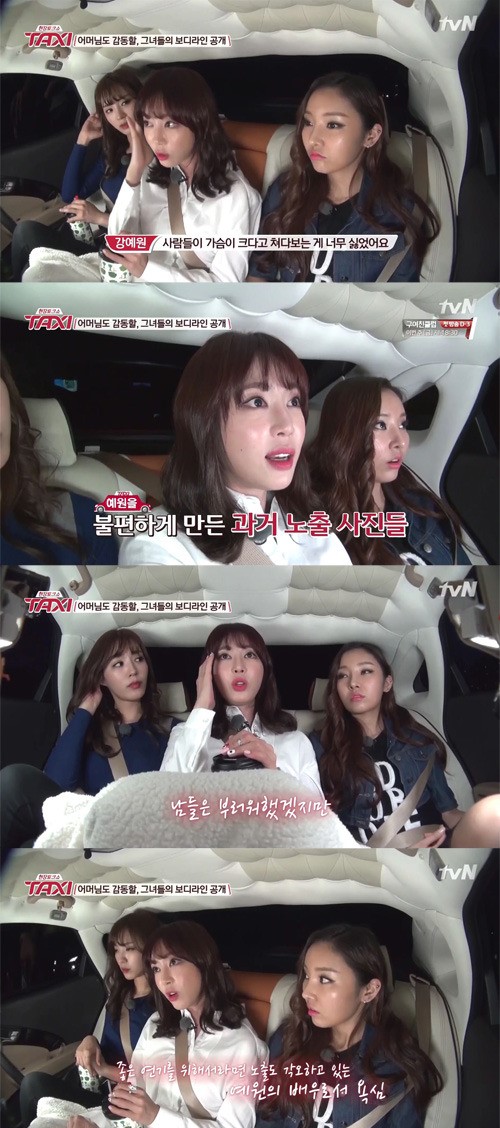 5일 밤 방송된 케이블채널 tvN ‘현장토크쇼 택시’에는 배우 강예원, KBS N 스포츠 아나운서 정인영, 모델 이현지가 출연했다.