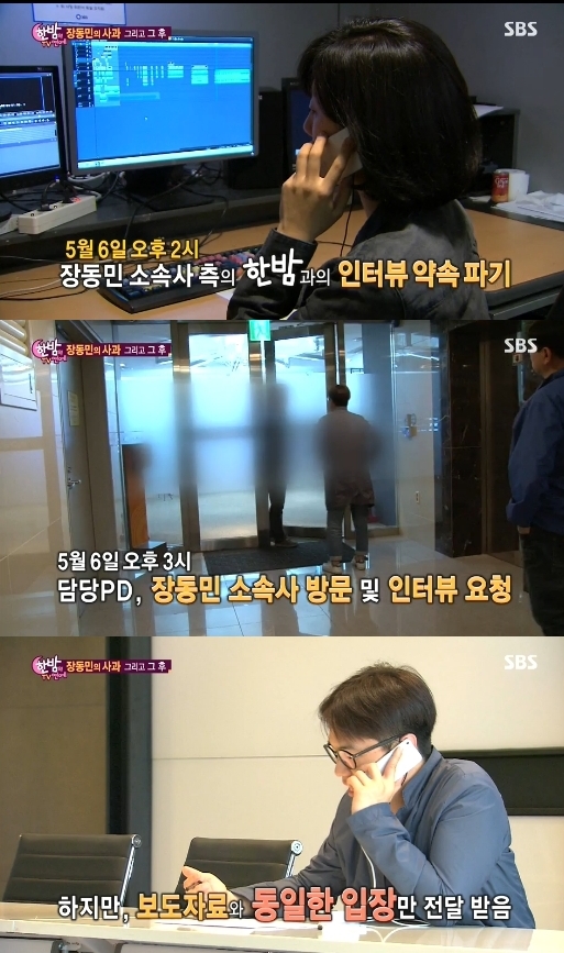 앞서 ‘한밤’은 지난달 29일 방송에서 장동민의 막말 파문에 대해 다뤘다. 제작진은 장동민이 자신을 고소한 A씨 측에 손편지를 전달하기 위해 찾아가 30초 정도 기다리고 돌아갔다고 전한 바 있다. 그러나 장동민 측은 3시간을 기다렸다고 밝혀 상반된 입장에 관심이 쏠렸다.