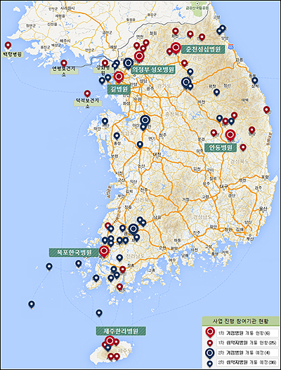 이번 시범사업에는 인천길병원, 제주한라병원, 춘천성심병원, 안동병원, 의정부성모병원, 목포한국병원 등 6개 거점병원과 취약지역의 26개 의료기관이 우선 참여한다. 참여 의료기관은 연말까지 10개 거점 병원과 60개 취약지역 의료기관으로 확대된다.