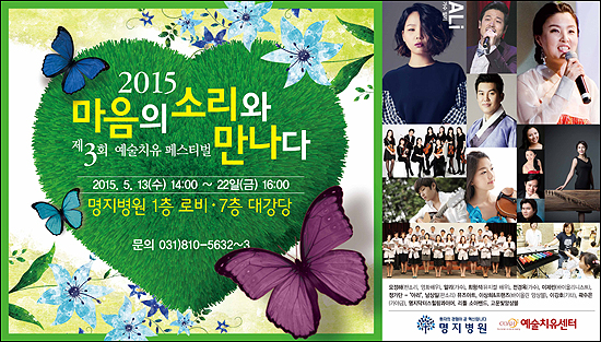 먼저 명지병원이 해마다 마련하는 환우와 의료진, 보호자와 예술인이 함께 어우러지는 예술치유페스티벌 중 13일의 개막공연에는 가수 알리가 특별 초청된다. 또 3회에 걸쳐 개최되는 힐링콘서트에는 영화배우 겸 국악인 오정해, 뮤지컬 배우 최형석(히든싱어 윤종신편 우승자), 바이올리니스트 이제린 등 수준급 연주자들이 대거 출연, 한껏 축제 분위기를 고조시킬 예정이다.