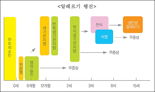 신체적으로 알레르기에 걸리기 쉬운 특성이 있는 아이들은 학령기를 지나 성인이 되는 과정에서 아토피피부염, 천식, 알레르기 비염 등 알레르기 질환이 순서대로 또는 복합돼서 나타나는 경우가 많은데 의학적으로는 이를 ‘알레르기 행진’이라고 한다.