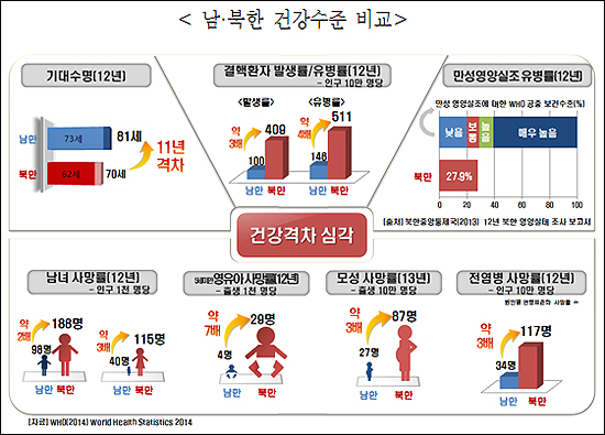 이로 인해 2012년을 기준으로 남·북한 간 평균 기대수명이 11년 차이가 나는 등 상대적으로 북한 주민들의 건강 수준이 저하된 상태이며, 대외관계가 장시간 고립된 상황에서 질병의 행태도 남한과 달라졌다는 것이 리포트의 지적이다.