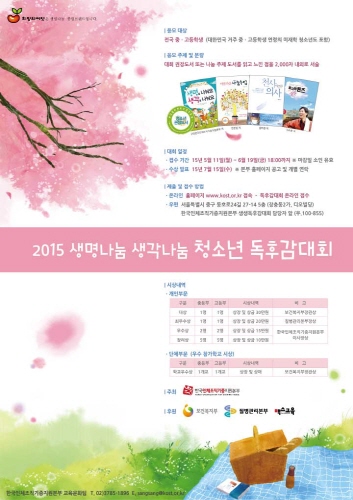 [쿠키뉴스=김단비 기자] 한국인체조직기증지원본부는 청소년들에게 나눔 정신과 생명 존중 인식을 함양하기 위해 ‘2015 생명나눔 생각나눔 청소년 독후감대회’를 5월 11일(월)부터 6월 19일(금)까지 개최한다.