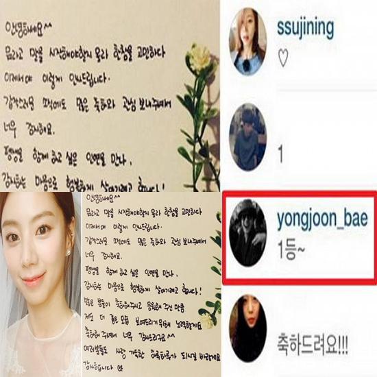 [쿠키뉴스=콘텐츠기획팀] 배우 배용준이 소속사를 통해 박수진과의 교제를 밝힌 가운데 자신의 피앙세 박수진의 SNS 게시물에 첫 번째 댓글을 달아 남친다운 무한한 애정을 과시했네요.