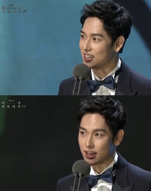 26일 서울 경희대 평화의 전당에서 열린 제51회 백상예술대상 시상식에서 임시완은 TV부문 남자 신인연기상 수상자로 호명된 뒤 무대에 올랐다.