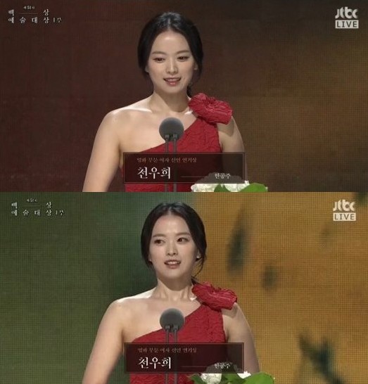 26일 서울 경희대 평화의 전당에서 열린 제51회 백상예술대상 시상식에서 천우희는 영화부문 여자 신인연기상 수상자로 호명된 뒤 무대에 올랐다.