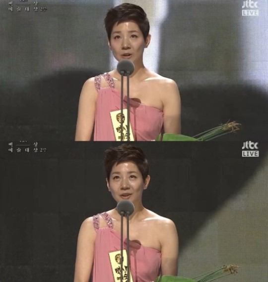 26일 서울 경희대 평화의 전당에서 열린 제51회 백상예술대상 시상식에서 김호정은 영화부문 여자 조연상 수상자로 호명된 뒤 무대에 올랐다.