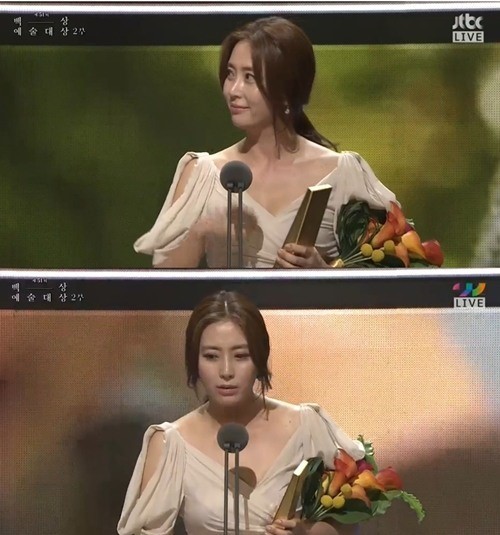 26일 서울 경희대 평화의 전당에서 열린 제51회 백상예술대상 시상식에서 송윤아는 TV부문 여자 최우수 연기상 수상자로 호명된 뒤 무대에 올랐다.