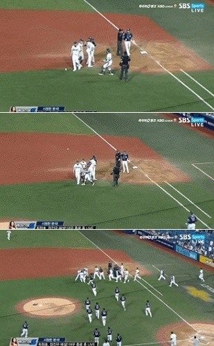 하지만 SNS와 인터넷 커뮤니티에선 때아닌 ‘대리 퇴장’ 논란이 일고 있다. 장민석이 공을 던지지 않았는데 대신 퇴장 당했다는 것이다. 중계 화면에서 해커를 향해 제일 먼저 달려온 장민석과 공의 방향이 일치하지 않는다는 이유에서다. 대리 퇴장설에 실제 공을 던진 선수가 누구였는지도 계속 논란거리다.