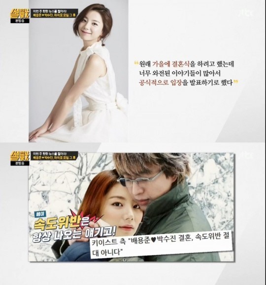 28일 방송된 JTBC 예능프로그램 ‘썰전’에선 최근 배우 배용준과 결혼을 발표한 박수진과 ‘하미모’(하나님을 사랑하는 미녀들의 모임) 멤버인 MC 박지윤이 조심스러운 듯 입을 열었다.