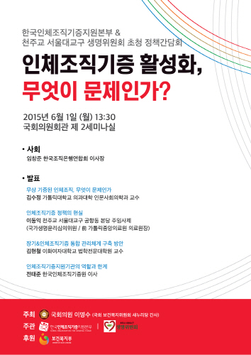 발표 후에는 임창준 한국조직은행연합회 이사장의 사회로 참석자와 함께 인체조직기증 활성방안을 논의하는 시간도 마련된다.