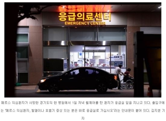 보건복지부는 1일 급성호흡기부전으로 사망한 메르스 의심환자 S씨(58·여)에 대해 유전자 검사를 한 결과 양성 판정이 나왔다고 2일 밝혔다. S씨는 천식으로 인한 호흡곤란으로 5월 11일부터 입원 치료를 받았으며 같은 달 15~17일 사이 국내 최초 메르스 환자 A씨(68)와 접촉했고 이후 상태가 악화해 치료 중 사망했다.