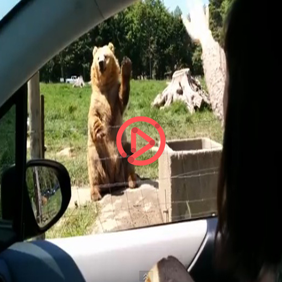 조수석에 있던 여성이 곰의 먹이로 식빵을 주기 전 손을 흔들며 반가움의 표현을 합니다.