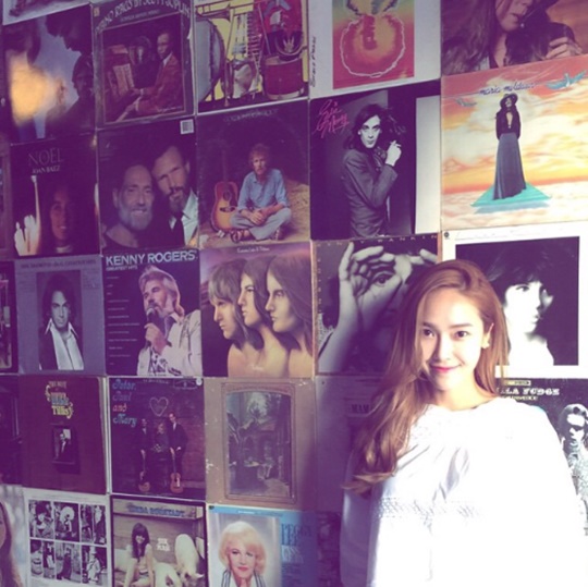 제시카는 9일 자신의 인스타그램에 사진 한 장을 게재했다. 제시카는 다양한 앨범으로 채워진 벽 앞에 서서 포즈를 취하고 있다. 긴 웨이브 머리를 한쪽으로 넘겨 고급스러운 분위기를 자아낸다.