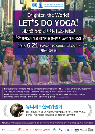 ‘UN 세계 요가의 날 함께 요가 해요(www.kycsportal.kr)’라는 이름으로 펼쳐지는 한국의 기념행사는 서울, 대구, 부산 등 전국 각지에서 21일 하루 동안 릴레이로 진행된다. 서울에서는 오전 10시부터 오후 1시까지 2000명의 요가동호인 및 시민들이 모여서 개막공연, 요가 퍼포먼스, 단체 요가 등을 즐길 예정이다. 인도에서는 3만5000명이 참석하는 초대형 요가시범 행사가 펼쳐지는 등 전세계에서 다양한 행사가 열릴 계획이다.