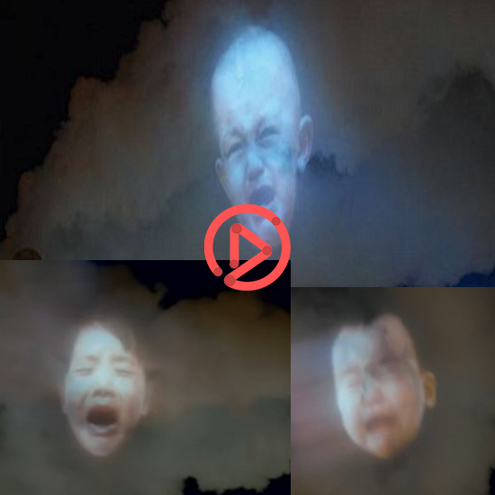 이들은 준비한 영사 장비를 이용해 깜깜한 밤하늘의 공장 연기를 배경으로 다양한 아기들의 얼굴을 비추기 시작합니다.