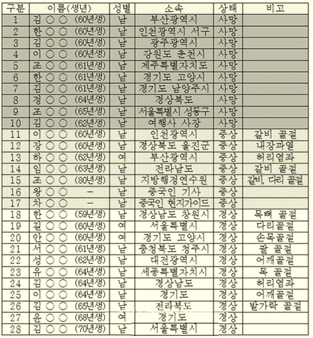 "[쿠키뉴스=김현섭 기자] 지방행정연수원이 1일 발생한 ‘중국 버스 추락사고’ 한국 사상자 명단을 공개했다.
