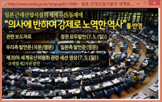 외교부는 홈페이지 팝업창을 통해 ‘일본 근대산업시설의 세계유산 등재에 의사에 반하여 강제로 노역한 역사를 반영’이라는 게시물을 올렸다. afero@kmib.co.kr 페이스북 fb.com/hyeonseob.kim.56