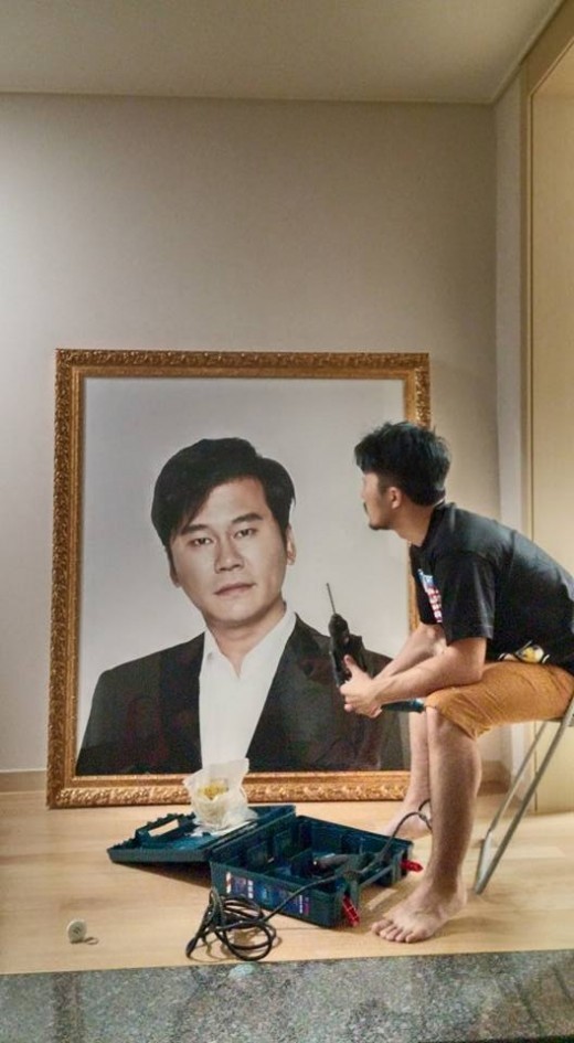 공개된 사진 속에는 YG엔터테인먼트 수장인 양현석의 거대한 사진을 벽에 걸기 위해 준비 중인 유병재의 모습이 담겨있다. 유병재는 마치 우상을 대하듯 존경심 어리게 바라보고 있다.