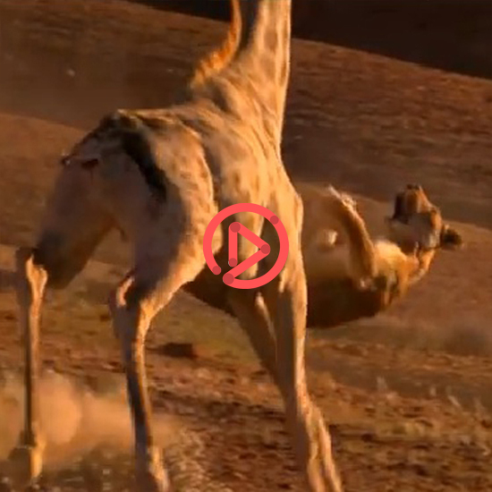 바로 눈앞에 달려오는 기린의 목덜미를 물기위한 상황으로 힘껏 도약했건만, 타깃을 잘못 잡은 걸까요?