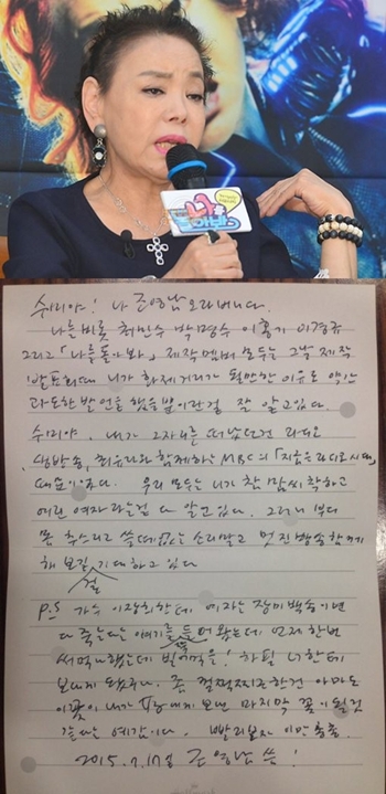 KBS ‘나를 돌아봐’ 제작진은 20일 오전 “지난 18일 오후 제작진은 이경규씨와 함께 김수미씨를 만나 장시간 많은 이야기를 나눴다”며 “특히 김수미씨가 하차한다는 소식을 기사로 접한 조영남씨는 김수미씨에게 프로그램을 같이 하고 싶다는 위로의 손편지를 꽃다발과 함께 이경규씨를 통해 전했다”고 밝혔다.