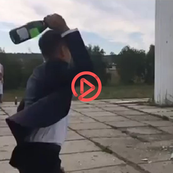 결혼식 피로연에서 한 하객이 샴페인 병을 병째로 벽에 던집니다.