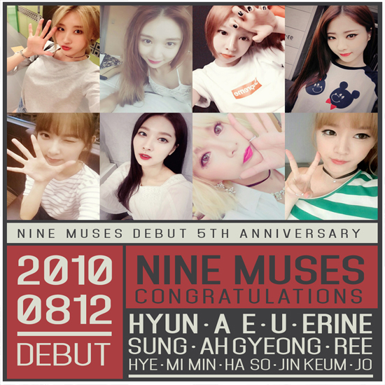 [쿠키뉴스=콘텐츠기획팀] 걸그룹 나인뮤지스(현아, 이유애린, 성아, 경리, 민하, 혜미, 소진, 금조)가 데뷔 5주년을 맞아 공식 트위터를 통해 팬들에게 감사의 인사를 전했습니다.