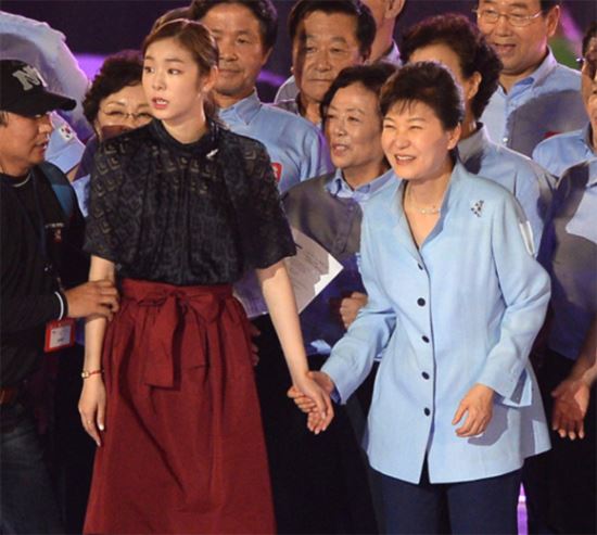 지난 15일 열린 광복 70주년 행사에서 박 대통령이 잡은 손을 김연아가 거부하는 듯한 모습이 포착됐기 때문인데요. 전후가 배제된 순간적 상황을 가지고 일어나고 있는 논란이기 때문에 ‘진실’은 알 수 없지만(개인적으론 진실을 굳이 알아야 하는 사안인지도 잘 모르겠습니다), ‘피겨 여왕’이 ‘대통령’을 데면데면 대하는 듯한 장면이 재미있어서인지 그날 이후 SNS 등 인터넷의 최고 화제는 단연 ‘김연아 박근혜’입니다.