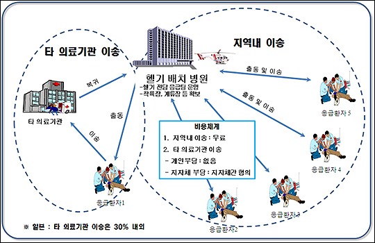 이에 복지부는 취약지역 응급환자의 신속한 이송·치료를 위해 2011년부터 전남(목포한국병원), 인천(가천대길병원)을 시작으로 2013년 강원(원주세브란스기독병원), 경북(안동병원), 2014년 충남(단국대병원)을 닥터헬기 배치지역으로 선정한 바 있다.