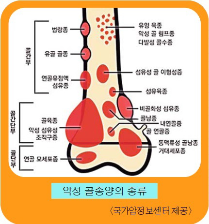 ◇악성 골종양, 팔·다리 등 주로 발생=악성 골종양은 발생하는 원발 부위에 따라 원발성과 전이성으로 구분하는데 근골격 조직에서 발생한 경우 원발성 골종양, 신체의 다른 부위에 생긴 종양이 근골격 조직으로 전이된 종양을 전이성 골종양이라고 한다. 근골격계 종양은 기본적으로 종양 세포가 어떤 세포에서 기원했는지에 따라 분류하는데 악성 골종양의 가장 흔한 종류로는 골육종이 있고, 그 외에 연골에서 발생하는 연골육종, 소아에게 흔한 유잉 육종 등이 있다. 흔히 발생하지 않는 악성 골종양으로는 섬유 육종, 악성 거대 세포종, 척색종 등이 있다.