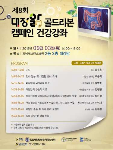 [쿠키뉴스=김단비 기자] 강남세브란스병원은 내달 3일 오후 2시부터 병원 3층 대강당에서 대장암 건강강좌를 개최한다.