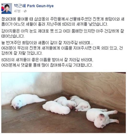 박 대통령은 이날 페이스북에 올린 글에서 “청와대에 들어올 때 삼성동의 주민들께서 선물해주셨던 진돗개 희망이와 새롬이가 어느덧 세월이 흘러 지난주에 5마리의 새끼를 낳았다”면서 “강아지들은 아직 눈도 제대로 못 뜨고 어미 품에만 있지만 아주 건강하게 잘 태어났다”고 말했다.