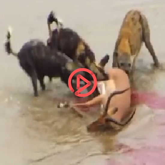 [쿠키뉴스=콘텐츠기획팀] 얕은 강물에 임팔라 한 마리가 들개들의 공격을 받고 있습니다.