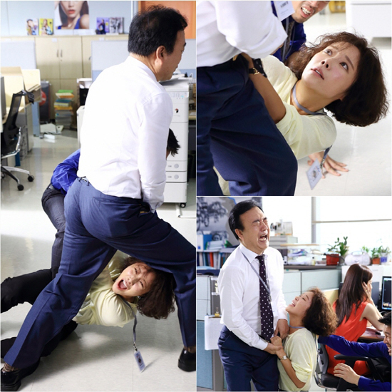 공개된 사진 속에는 황정음의 남다른 첫 출근 모습이 담겨 있는데, 황정음은 마치 ‘유격훈련’을 방불케 할 정도로 구르고, 매달리며 김하균(관리부장 역)과 육탄전을 벌이고 있는 모습으로, 김하균의 바짓가랑이를 부여잡고, 처절하게 절규하는 황정음의 모습이 배꼽을 잡게 만듭니다.