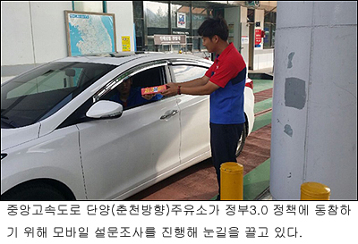 "[쿠키뉴스=박주호 기자] 중앙고속도로 단양(춘천방향)주유소가 정부3.0 정책에 동참하기 위해 QR코드를 활용한 고객 만족도 조사를 벌여 눈길을 끌고 있다.