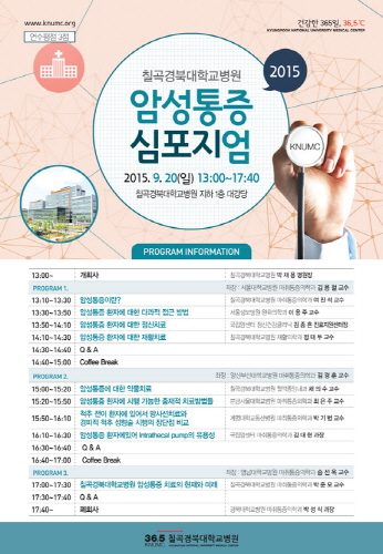 [쿠키뉴스=김단비 기자] 칠곡경북대학교병원 마취통증의학과가 오는 20일(일요일) 병원 대강당에서 2015 암성통증 심포지엄을 개최한다.
