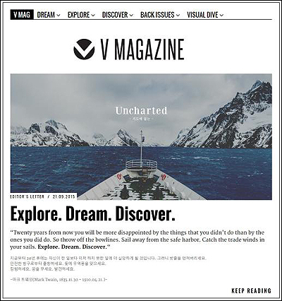 류방원 편집장은 창간호 발간과 관련, “휘발성 자극성 뉴스들이 대세인 지금, 진정성을 가진 콘텐츠의 필요성이 대두되고 있다”며 “20~30대 모바일 세대에게 탐험하고 꿈꾸고 발견하는 비전을 제시하기 위해 ‘브이 맥’을 기획했다”고 밝혔다.